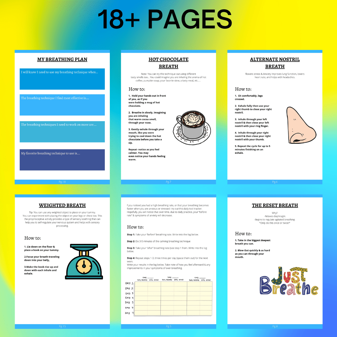 It includes 13 different breathing techniques, psychoeducation on breathing, and a fill-in-your-own breathing plan.
