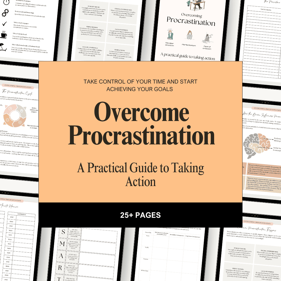 Break free from the invisible chains of delay that have kept your dreams just out of reach with our Overcome Procrastination Guide & Workbook. This 29-page transformation blueprint doesn't just explain why you procrastinate—it rewires your relationship with time itself, turning what once felt like an uphill battle into a seamless flow of productive momentum. Unlike generic productivity advice that ignores the psychological underpinnings of procrastination, our research-backed approach targets the specific neural pathways that trigger your unique delay patterns, allowing you to recognize and redirect them before they hijack your day.