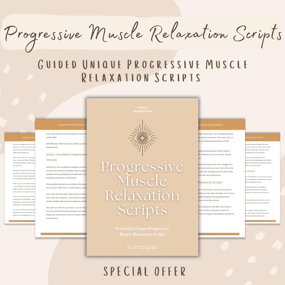 Transform your daily stress into deep serenity with our comprehensive Progressive Muscle Relaxation (PMR) script collection - your personal gateway to profound relaxation anytime, anywhere. This meticulously crafted bundle features 10 professionally written scripts, thoughtfully sequenced to guide you from tension to tranquility through gentle, systematic muscle engagement and release. Each script is carefully paced and voiced in soothing, crystal-clear language that makes it effortless to follow along, whether you're a PMR newcomer or a seasoned practitioner. From quick 5-minute tension tamers perfect for busy workdays to immersive full-body journeys that prepare you for restorative sleep, this versatile collection adapts to your schedule and stress-relief needs. Downloaded instantly in PDF format, these scripts become your always-accessible path to physical and mental calm, empowering you to melt away tension whenever life's pressures mount.