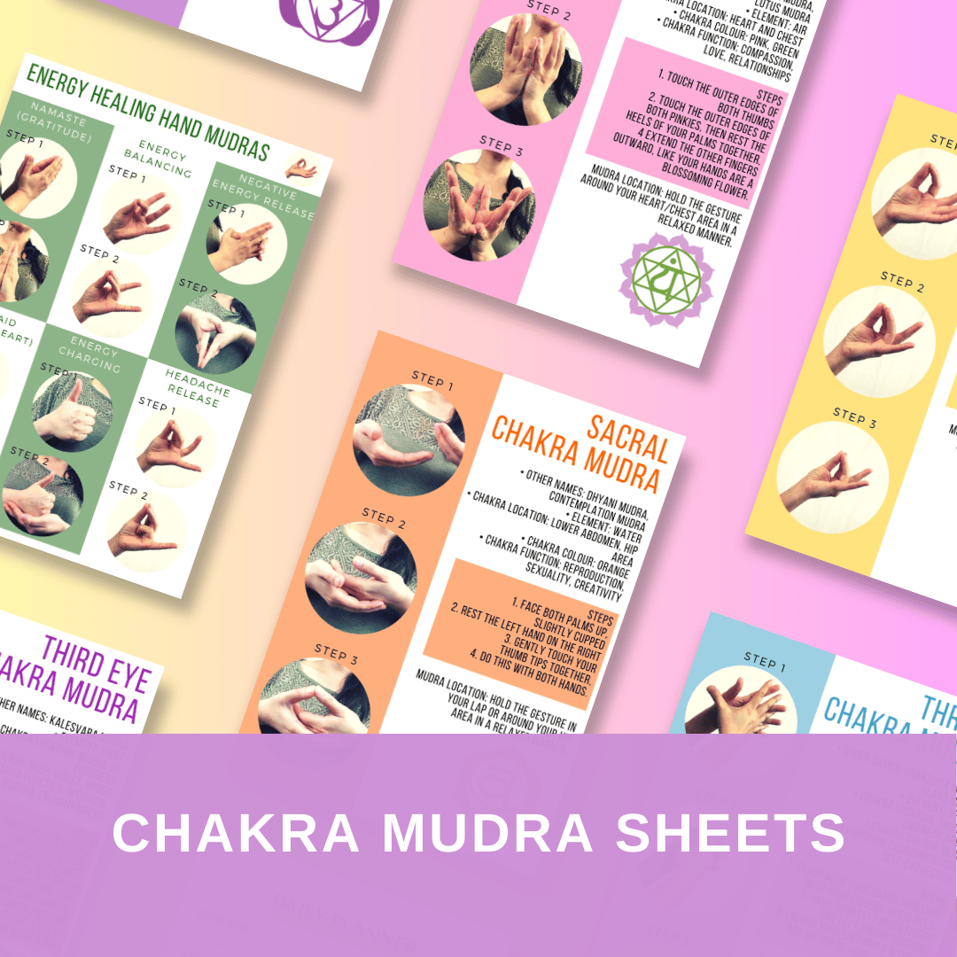 Our Chakras Mudra Sheets feature detailed instructional photos and enlightening information about each chakra’s Mudra, color, corresponding element, frequency and so much more... This interactive guide aids in discovering the inherent symbolism of each chakra, connecting you on a deeper level with your inner self.