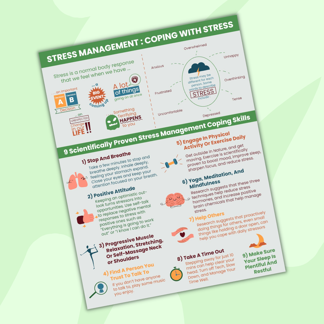 Coping with stress printable with 9 scientifically proven ways to manage stress. Can be posted in your home, office, in a calm down corner, classroom, or hallway bulletin board; used as relaxation and calming skills, calm down strategies.