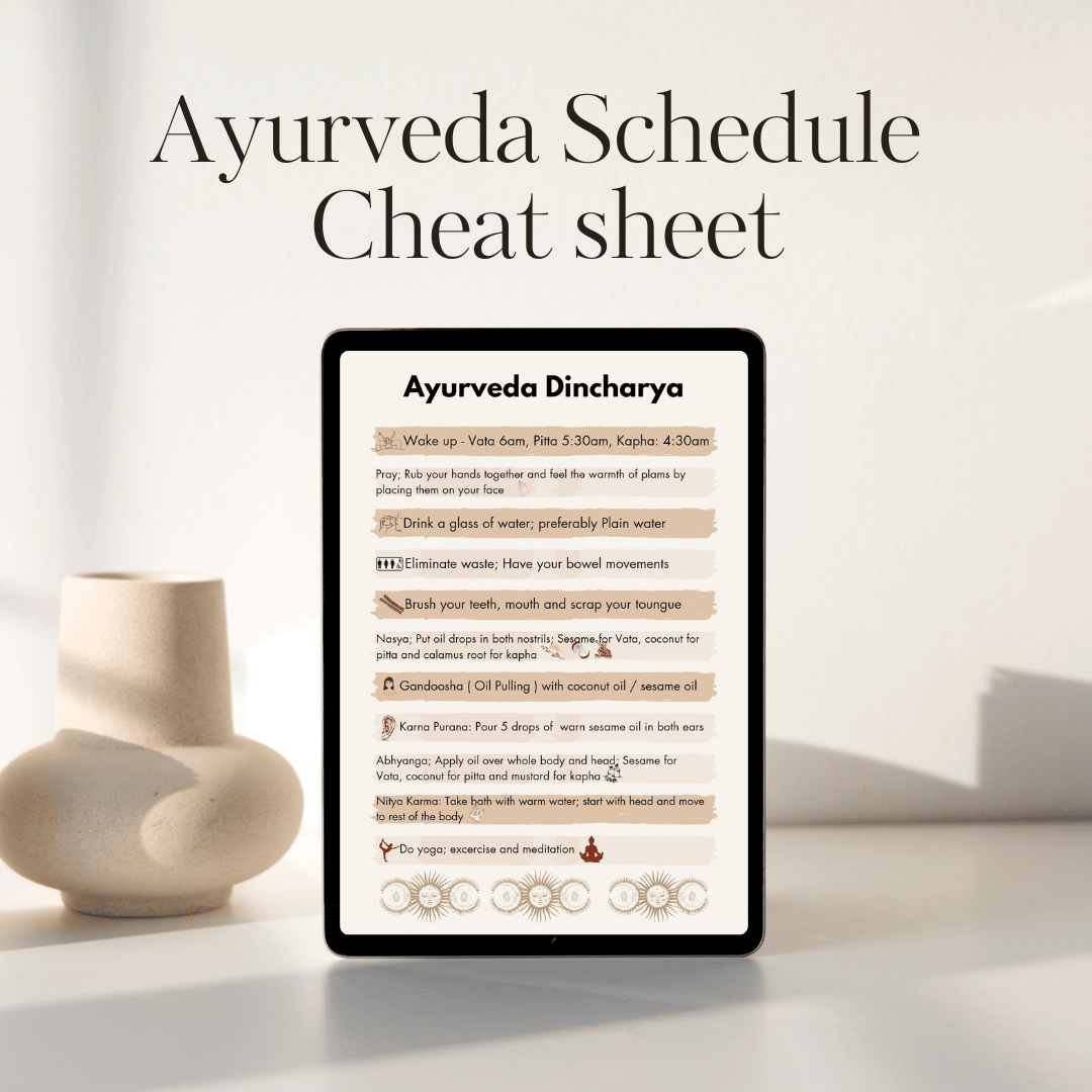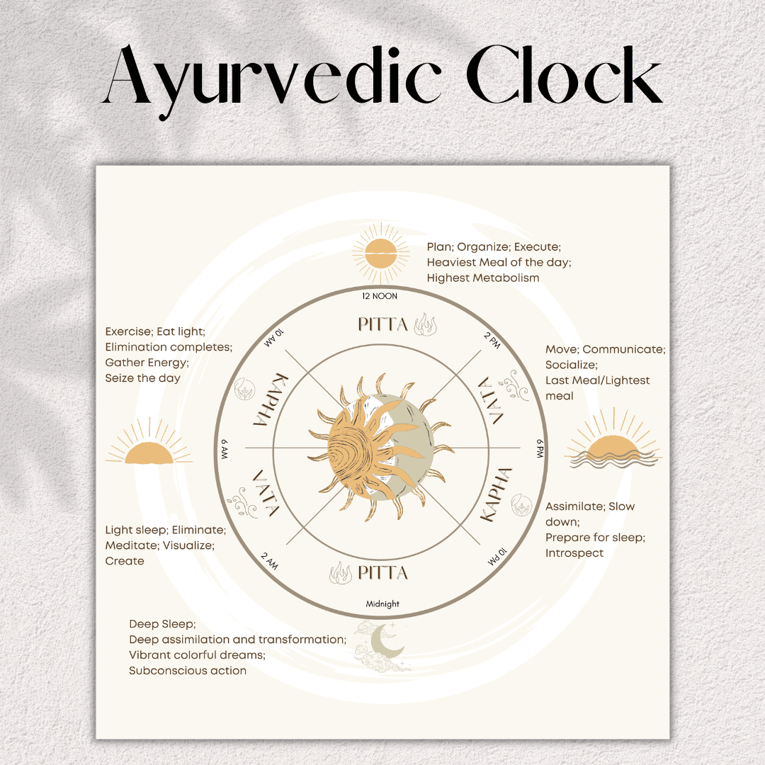 An Ayurvedic Dincharya poster displays the daily routine to be followed based on ancient science of ayurveda, allowing you to keep track of time while also promoting mindfulness and balance in your daily life.