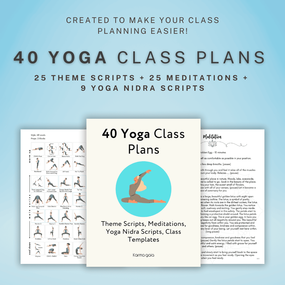 Transform your teaching practice with the ultimate yoga instructor's toolkit that eliminates planning stress and amplifies your creative potential. This comprehensive 300+ page digital resource delivers everything you need to lead inspiring, professionally structured classes: 40 fully sequenced class plans (26 Hatha and 14 Gentle), 25 themed scripts with integrated openings and closings, plus an extensive collection of meditations, Yoga Nidra scripts, and detailed cue cards for 76 poses. Whether you're crafting a heart-opening flow or a grounding gentle practice, you'll have expertly designed sequences at your fingertips, ready to customize with your unique teaching voice.