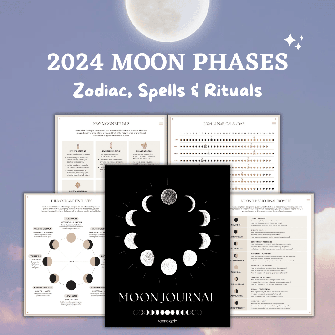 This  Moon Magic 2024 Journal is a comprehensive workbook that intertwines the mysteries of lunar phases, astrology, and the practice of witchcraft through magic, spells, and rituals. It offers a unique feature for tracking menstrual cycles alongside the moon's phases, fostering a deeper understanding of personal rhythms and natural cycles. The journal includes 2024 moon phases calendars and worksheets. This essential tool not only aids in personal growth and intention setting but also serves as a key to unlocking the profound connections between our bodies, the moon, and the mystical world around us.