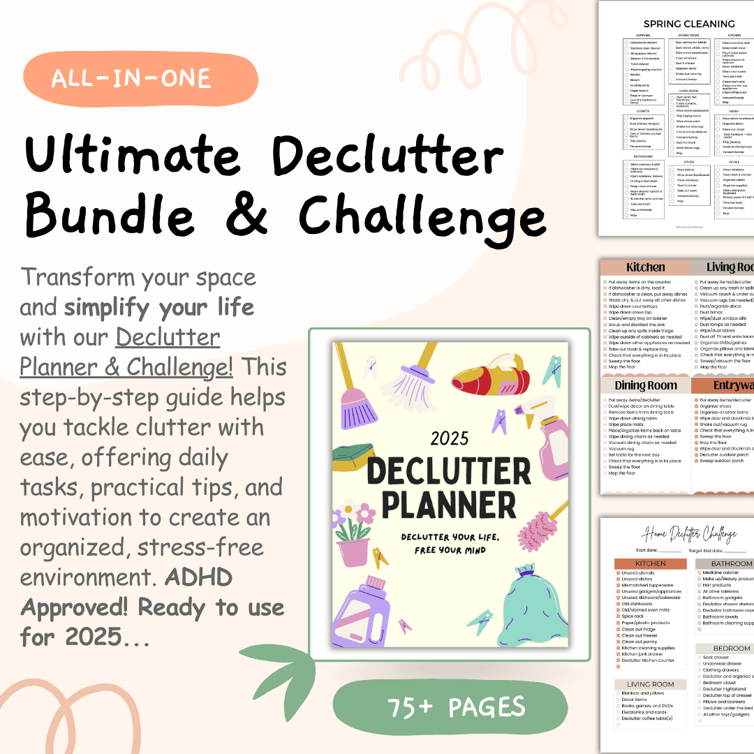 Investing in the Declutter Planner & Challenge means investing in a more peaceful and productive lifestyle. By eliminating unnecessary clutter, you'll not only create a visually appealing space but also improve your mental clarity, reduce stress, and boost productivity. The planner is designed to fit into any schedule, allowing you to progress at your own pace while providing the structure and accountability needed to succeed. Plus, it offers helpful organization strategies, decluttering checklists, and space-saving solutions to maintain your clutter-free environment long-term. Start today and experience the joy of living with less and achieving more!